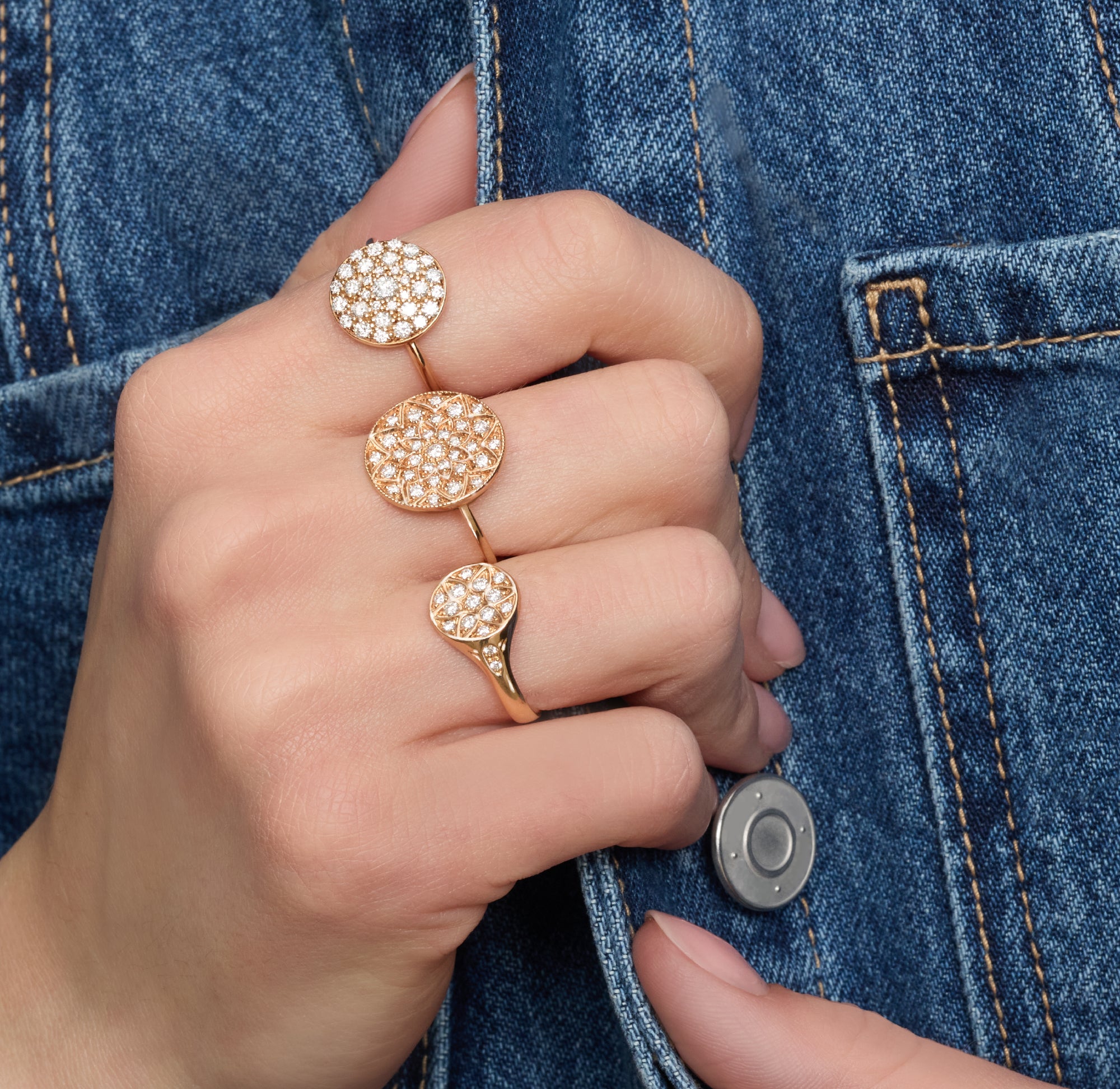 Un design delicatamente arrotondato tempestato di diamanti è custodito al centro di bracciali e anelli in oro 18 kt. La Collezione Pavè di Marco Gerbella rivisita un classico della gioielleria e lo riveste di contemporaneità.