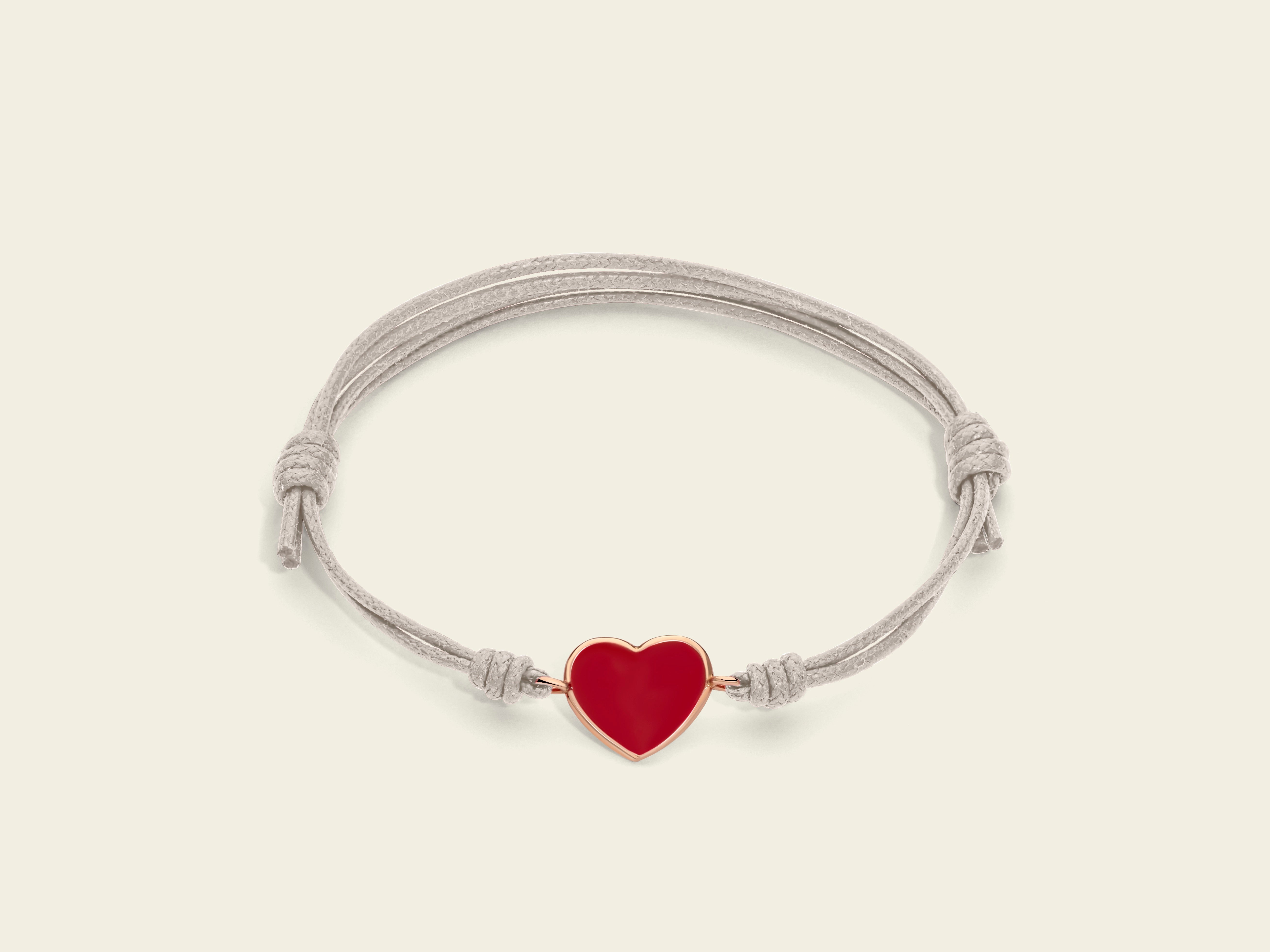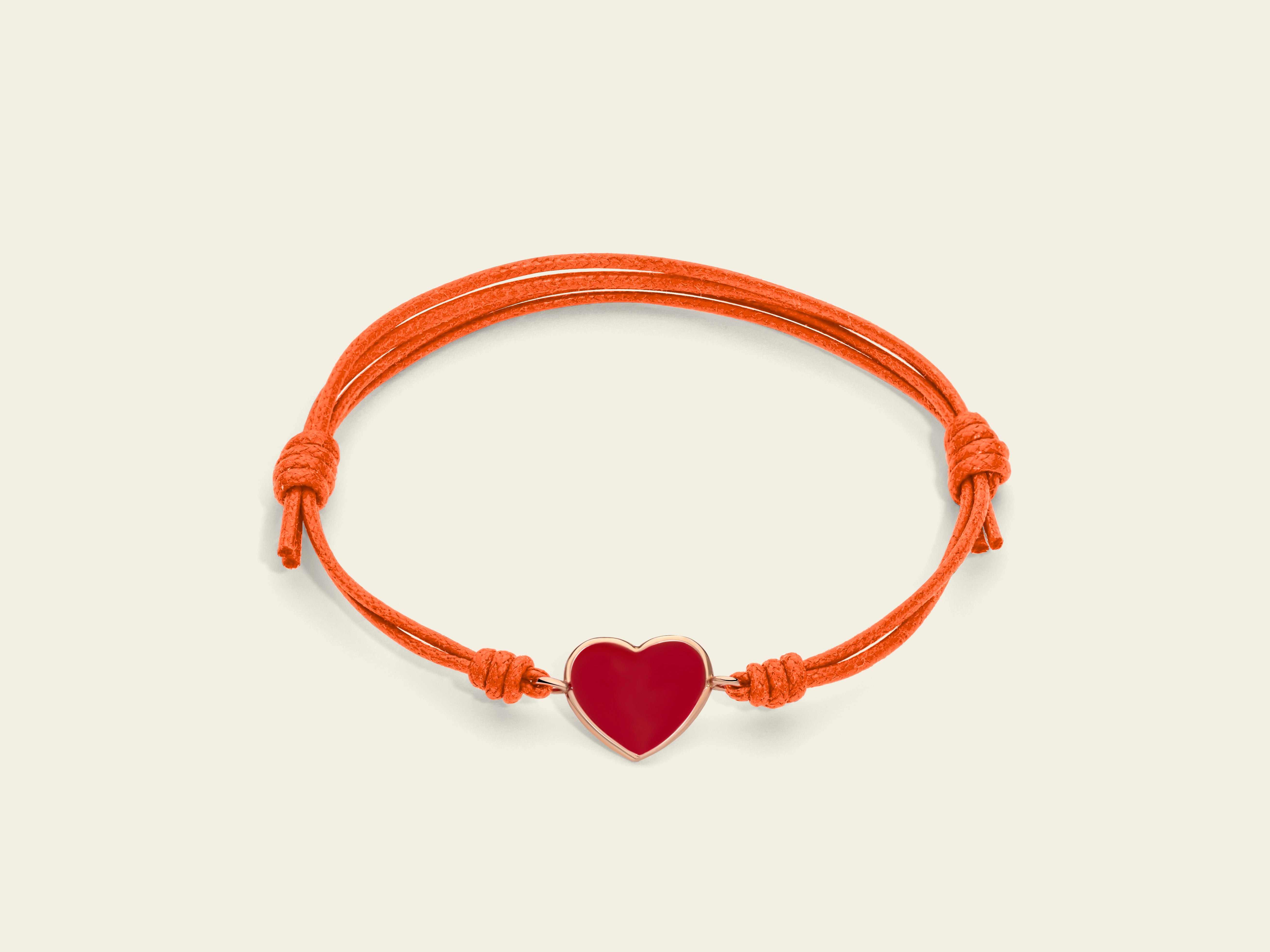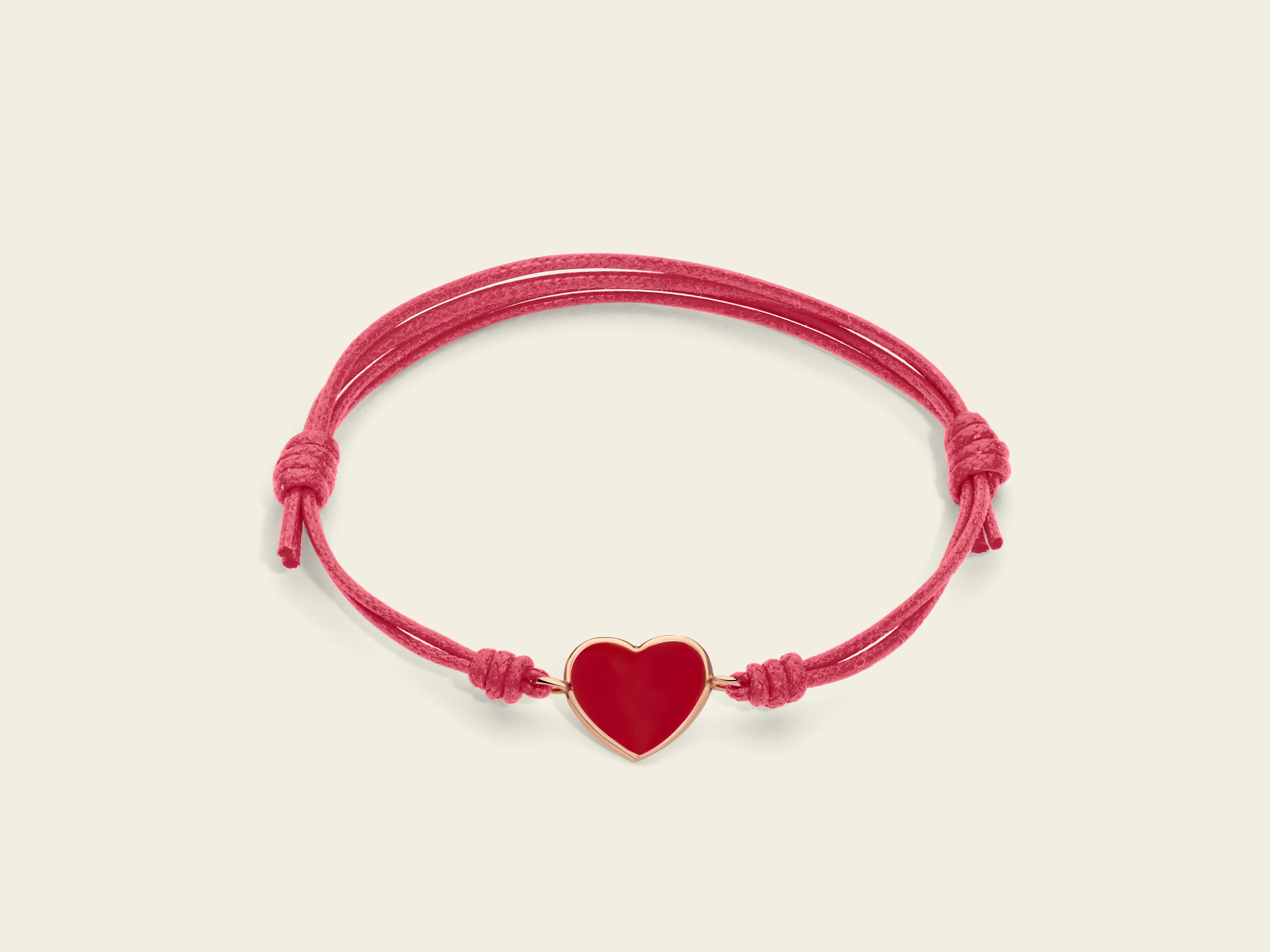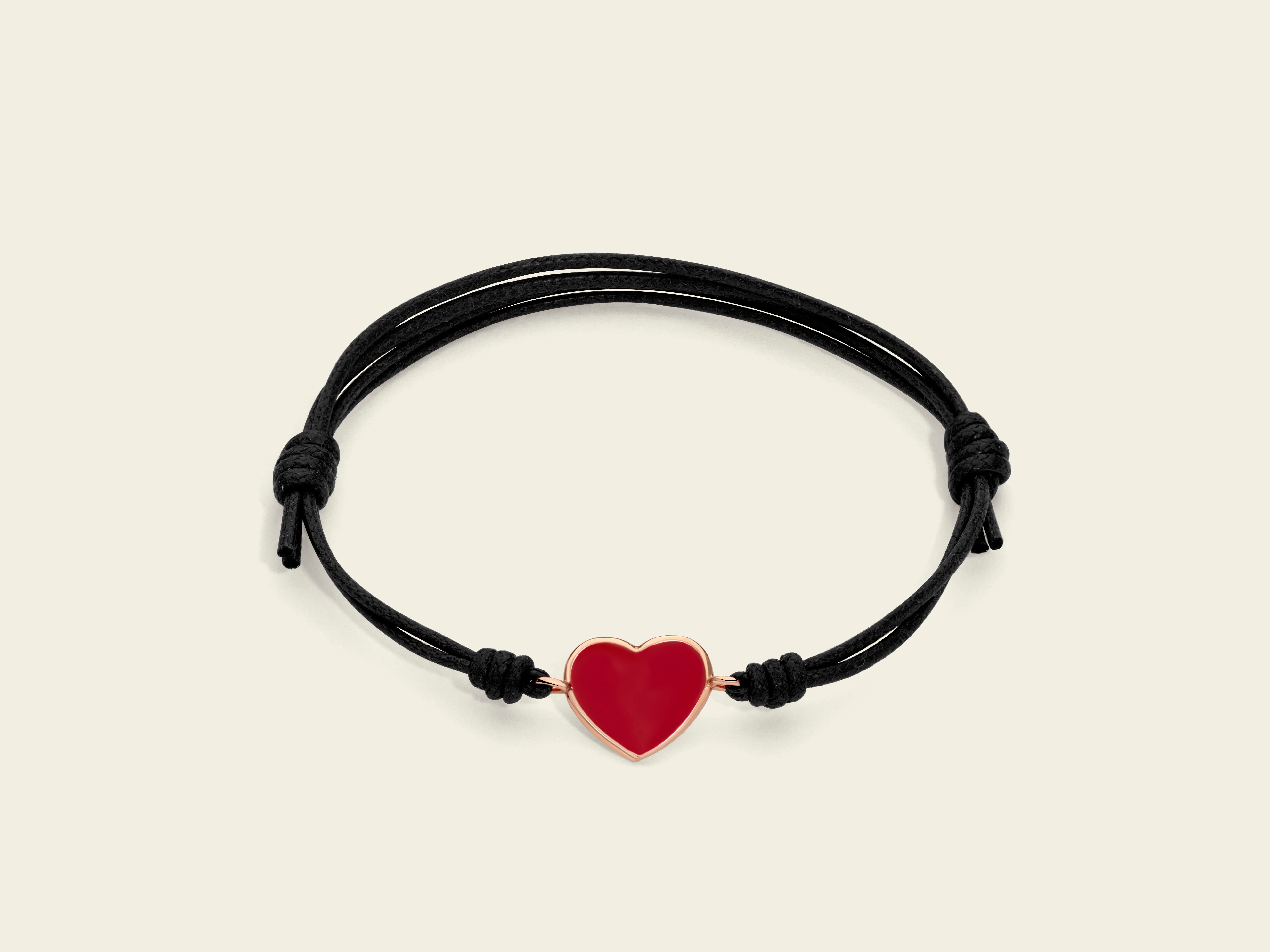 Follow the beat of your heart and fall in love every day with the jewellery in the Cuore collection. The cord bracelet features an 18k gold and red enamel heart in the centre. Wear it on its own or combined with other jewellery from the Cuore collection.