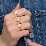 Eleva la tua collezione di gioielli con questo anello della collezione Sigilli. Realizzato in oro rosa 18 kt , presenta al centro un elemento tondo inciso e incastonato di diamanti bianchi. Scegli il tuo modello preferito e abbinalo alle altre creazioni della collezione Sigilli.