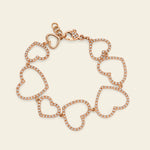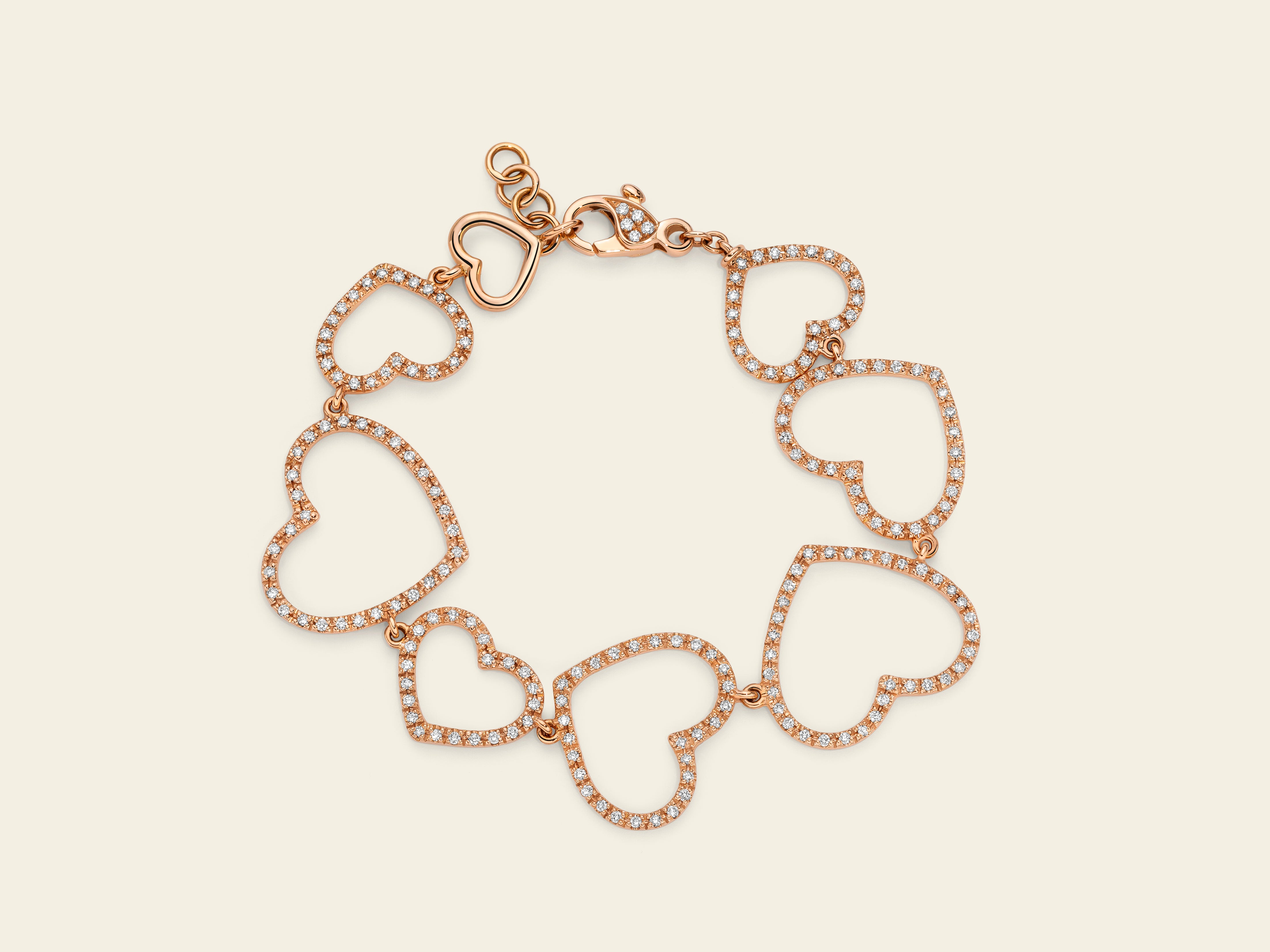 Segui il battito del tuo Cuore e innamorati ogni giorno dei gioielli della Collezione Cuore. Il bracciale, realizzato in oro rosa 18 kt e incastonato di diamanti, presenta un design a cuori di diverse dimensioni. Indossalo da solo o abbinato ad altri gioielli della collezione Cuore.