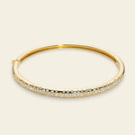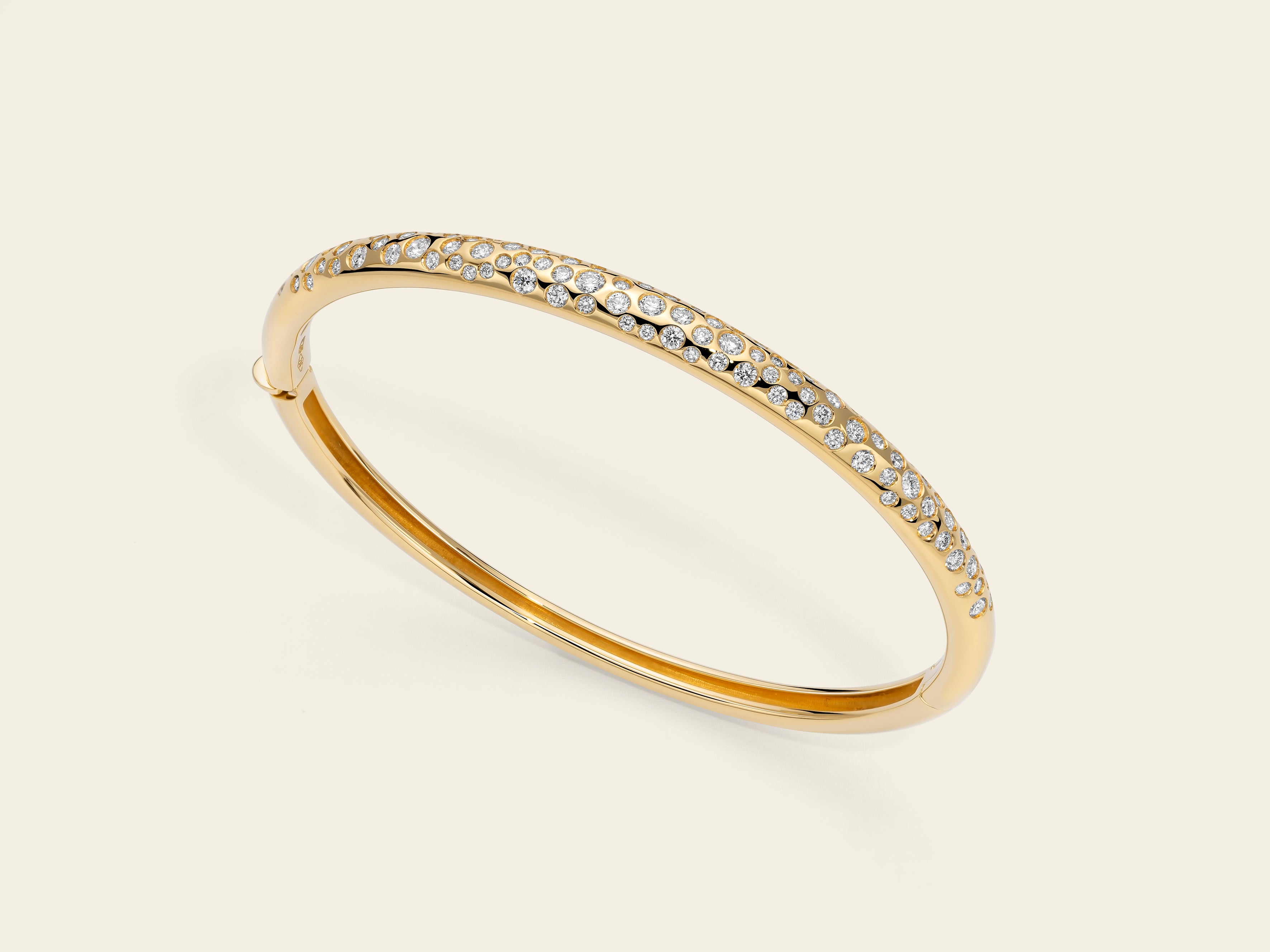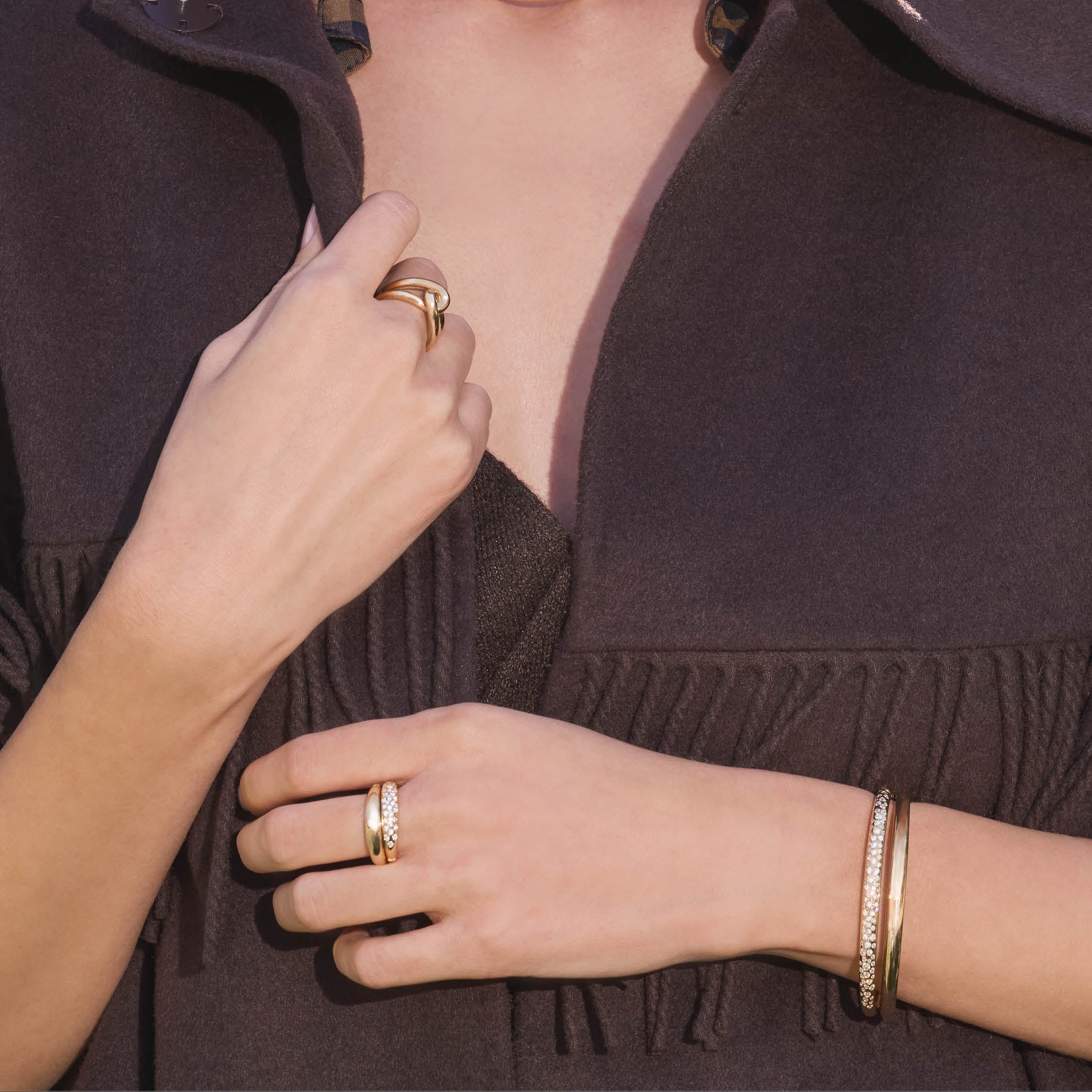 Il bracciale rigido della collezione Flow in oro 18 carati e diamanti interpreta la forma in chiave moderna: volumi pieni, linee morbide e leggerezza assoluta grazie alla struttura in canna vuota. Un gioiello elegante e contemporaneo, perfetto per ogni occasione.