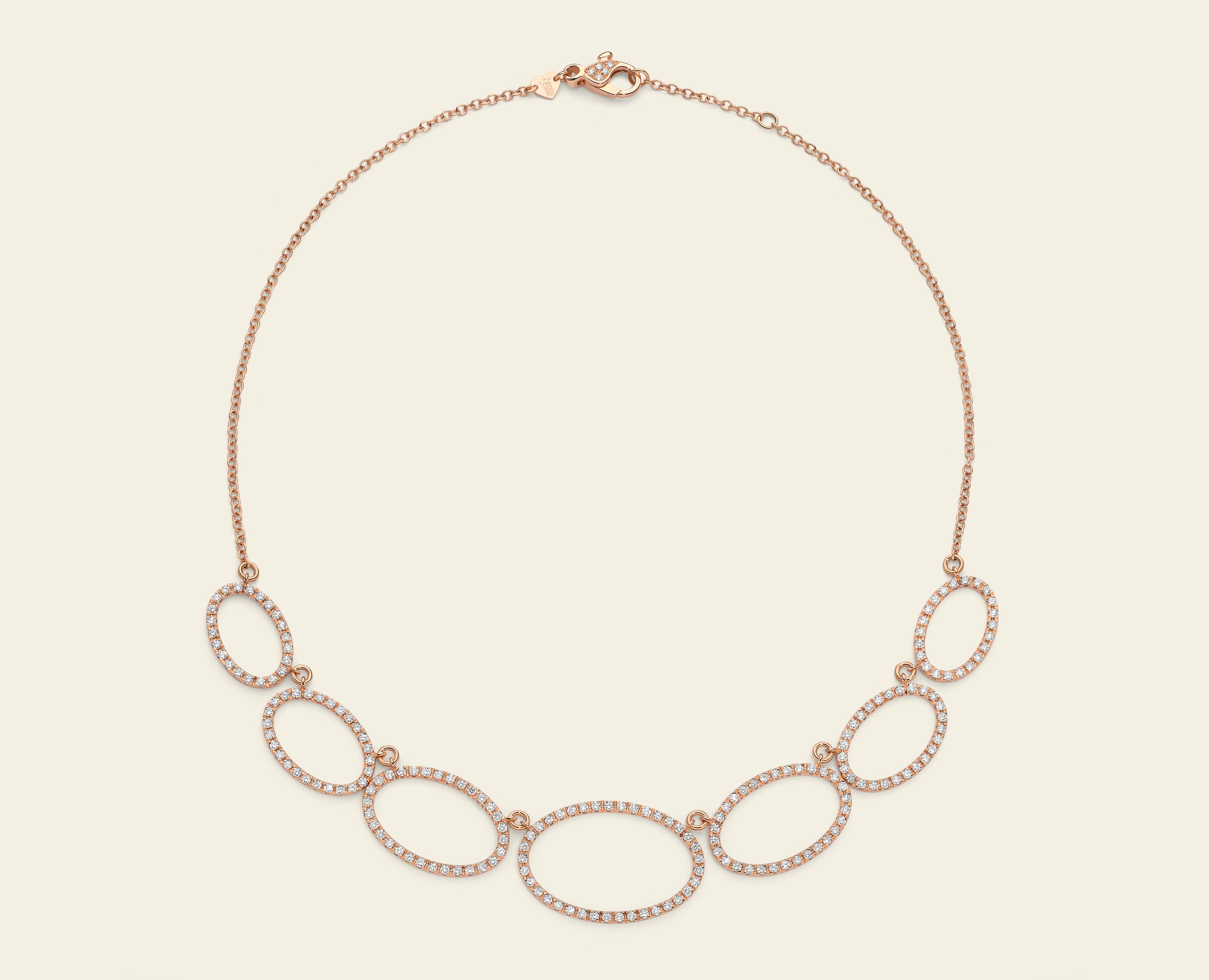 Un design delicatamente arrotondato tempestato di diamanti definisce questa collana in oro rosa 18 kt. La Collezione Bolle di Marco Gerbella rivisita un classico della gioielleria e lo riveste di contemporaneità.
